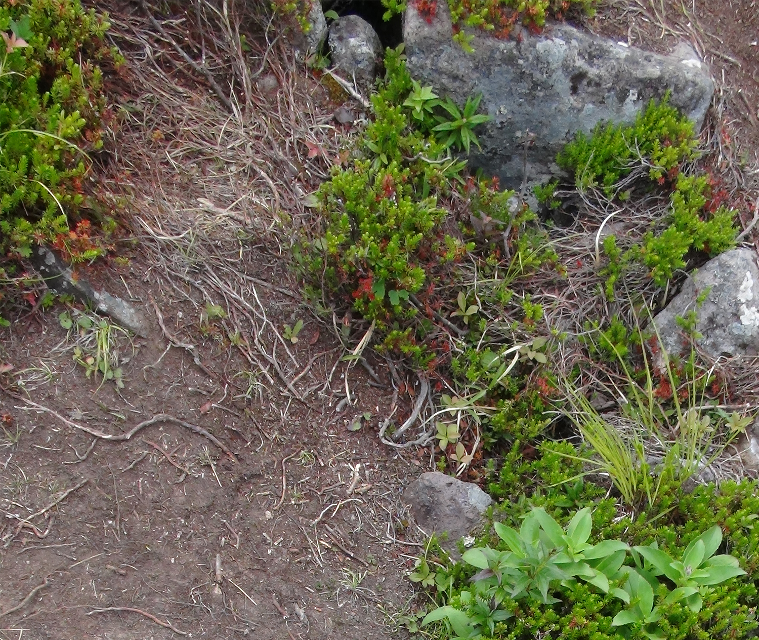 土や草や樹木におおわれて一見して岩場に思えないところも、地下のすきまをナキウサギが利用していることが多いのです。
